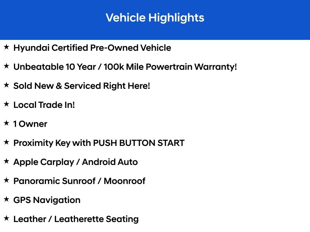 Hyundai Certified Pre-Owned Vehicle, Unbeatable 10 Year / 100k Mile Powertrain Warranty!, Sold New & Serviced Right Here!, Local Trade In!, 1 Owner, Proximity Key with PUSH BUTTON START, Apple Carplay / Android Auto, Panoramic Sunroof / Moonroof, GPS Navigation, Leather / Leatherette Seating, Heated Front Seats, Blind Spot Monitoring, Front Collision Avoidance, Lane Keep Assist, Rearview Camera, Smart Cruise, Blue Link Ready!, Premium Bose Audio System, 2 Sets of Keys!, Black w/Leatherette/Suede Combination Seating Surfaces. Hyundai Sonata 2023 Serenity White SEL Plus Certified. Hyundai Certified Used Vehicles Details: