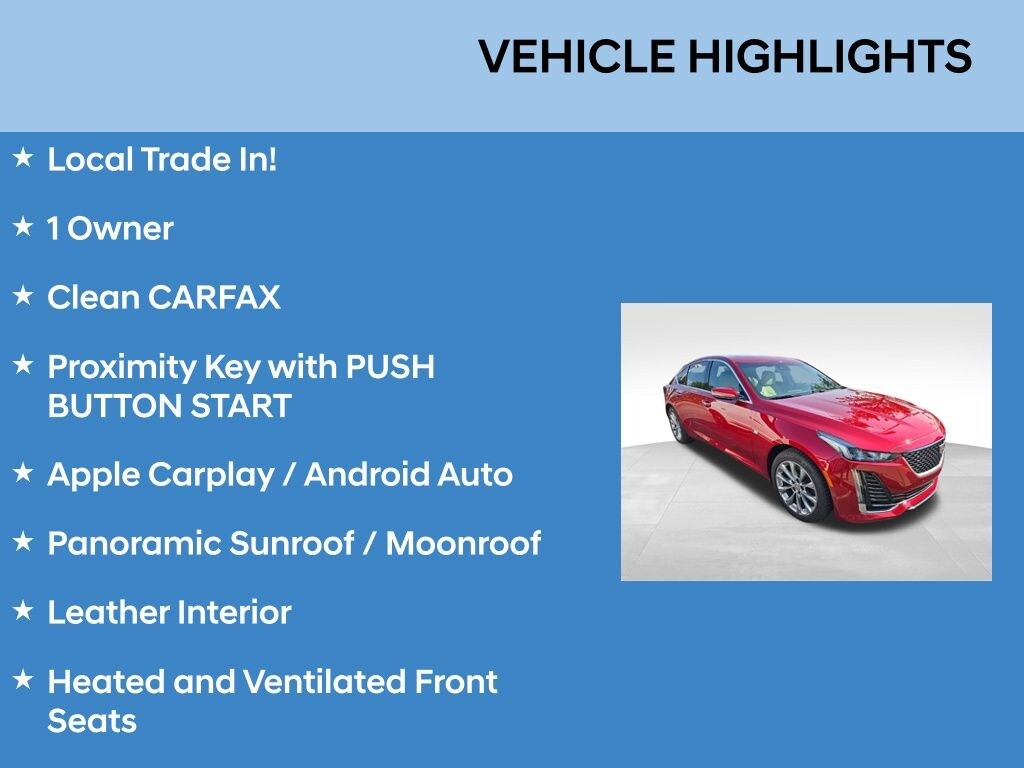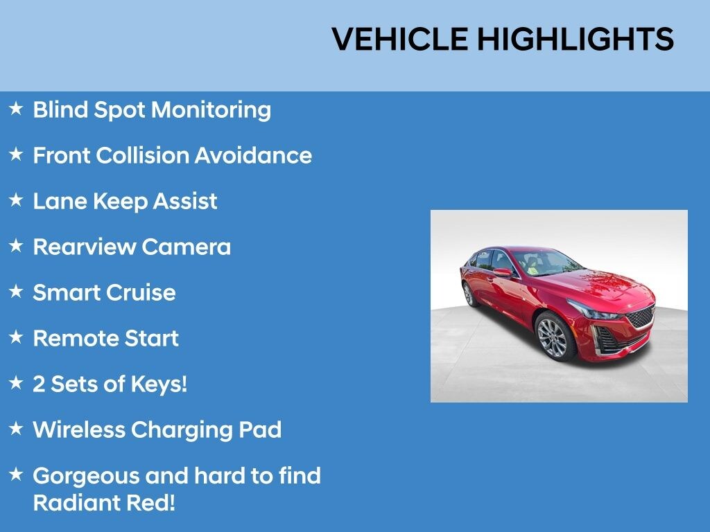 Local Trade In!, 1 Owner, Clean CARFAX, Proximity Key with PUSH BUTTON START, Apple Carplay / Android Auto, Panoramic Sunroof / Moonroof, Leather Interior, Heated and Ventilated Front Seats, Blind Spot Monitoring, Front Collision Avoidance, Lane Keep Assist, Rearview Camera, 12" Diagonal HD Color Reconfigurable Driver Cluster, 3 USB Ports, 4-Wheel Disc Brakes, 9 Speakers, ABS brakes, Air Conditioning, Alloy wheels, AM/FM radio: SiriusXM with 360L, Apple CarPlay/Android Auto, Auto High-beam Headlights, Auto-dimming door mirrors, Auto-dimming Rear-View mirror, Automatic Stop/Start w/Disable, Automatic temperature control, Body-Color Heated Pwr-Adjustable Outside Mirrors, Bose Performance Series Premium 15-Speaker System, Brake assist, Bumpers: body-color, Climate Package, Compass, Delay-off headlights, Driver 4-Way Power Lumbar Seat Adjuster, Driver door bin, Driver vanity mirror, Dual Diagonal Color Driver Information Center, Dual front impact airbags, Dual front side impact airbags, Electronic Stability Control, Emergency communication system: OnStar and Cadillac connected services capable, Exterior Parking Camera Rear, Four wheel independent suspension, Front & Rear Park Assist, Front anti-roll bar, Front Bucket Seats, Front Center Armrest, Front Cornering LED Lamps, Front dual zone A/C, Front Passenger 4-Way Power Lumbar Seat Adjuster, Front Passenger 8-Way Power Seat Adjuster, Front reading lights, Fully automatic headlights, Garage door transmitter, HD Radio, HD Rear Vision Camera, Head-Up Display, Heated door mirrors, Heated Driver & Front Passenger Seats, Heated Steering Wheel, Illuminated entry, Illuminating Front Sill Plates, Inside Rear-View Auto-Dimming Mirror, Knee airbag, Lane Keep Assist w/Lane Departure Warning, Leather Seating Surfaces, Leather steering wheel, LED Reflective Windshield Alert, Lighting Package, Low tire pressure warning, Memory seat, Navigation & Bose Premium Audio Package, Occupant sensing airbag, Outside temperature display, Overhead airbag, Overhead console, Panic alarm, Passenger door bin, Passenger vanity mirror, Power door mirrors, Power driver seat, Power passenger seat, Power steering, Power windows, Preferred Equipment Group 1SD, Premium 9-Speaker Audio System Feature, Radio data system, Radio: Cadillac User Experience, Radio: Cadillac User Experience w/Embedded Nav, Rain sensing wipers, Rear anti-roll bar, Rear reading lights, Rear seat center armrest, Rear window defroster, Remote keyless entry, SiriusXM w/360L, Speed control, Speed-sensing steering, Split folding rear seat, Steering wheel memory, Steering wheel mounted audio controls, Steering Wheel Mounted Paddle Shift Controls, Tachometer, Technology Package, Teen Driver, Telescoping steering wheel, Tilt steering wheel, Traction control, Trip computer, Turn signal indicator mirrors, UltraView Dual Pane Sunroof, Variably intermittent wipers, Ventilated Driver & Front Passenger Seats, Voltmeter, Wheels: 18" Alloy w/Manoogian Silver Finish, Smart Cruise, Remote Start, 2 Sets of Keys!, Wireless Charging Pad, Gorgeous and hard to find Radiant Red!, All Wheel Drive!, Navigation & Bose Premium Package!, Technology Package!, Heads Up Display!, Climate Package!, Heated Steering Wheel. Cadillac CT5 2023 Radiant Red Tintcoat Premium Luxury CARFAX One-Owner. Clean CARFAX. Odometer is 938 miles below market average!