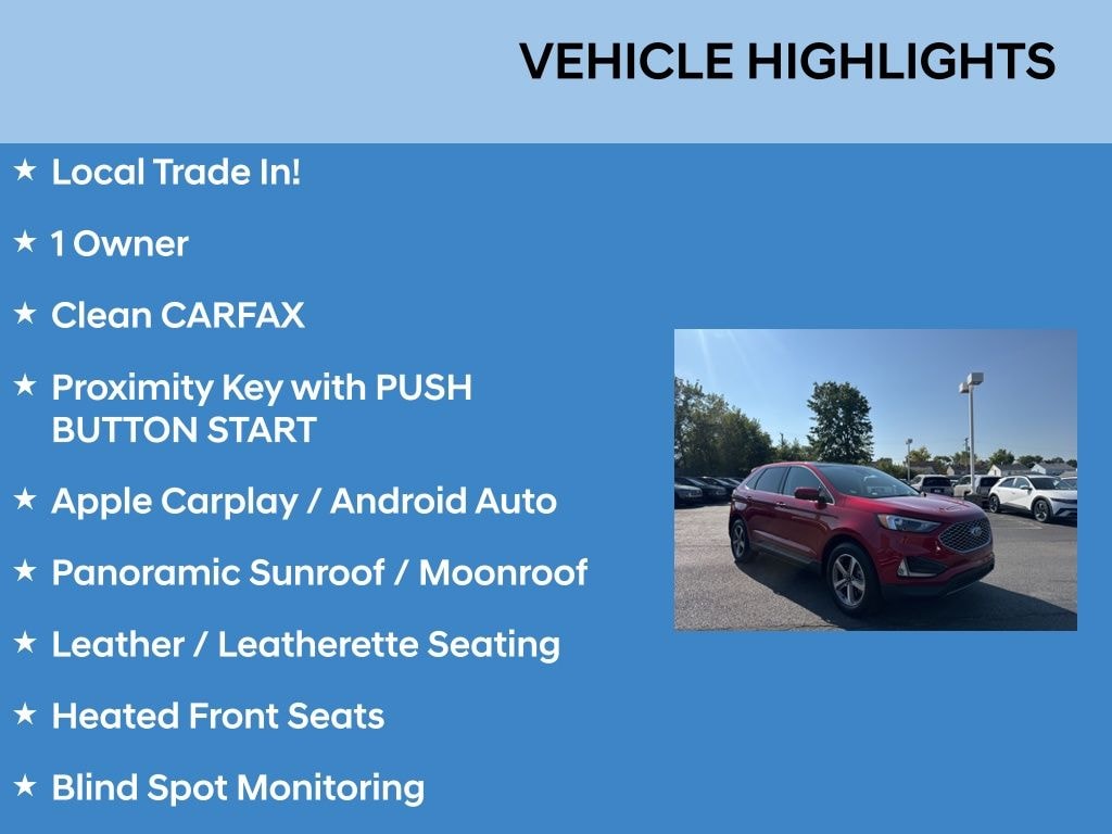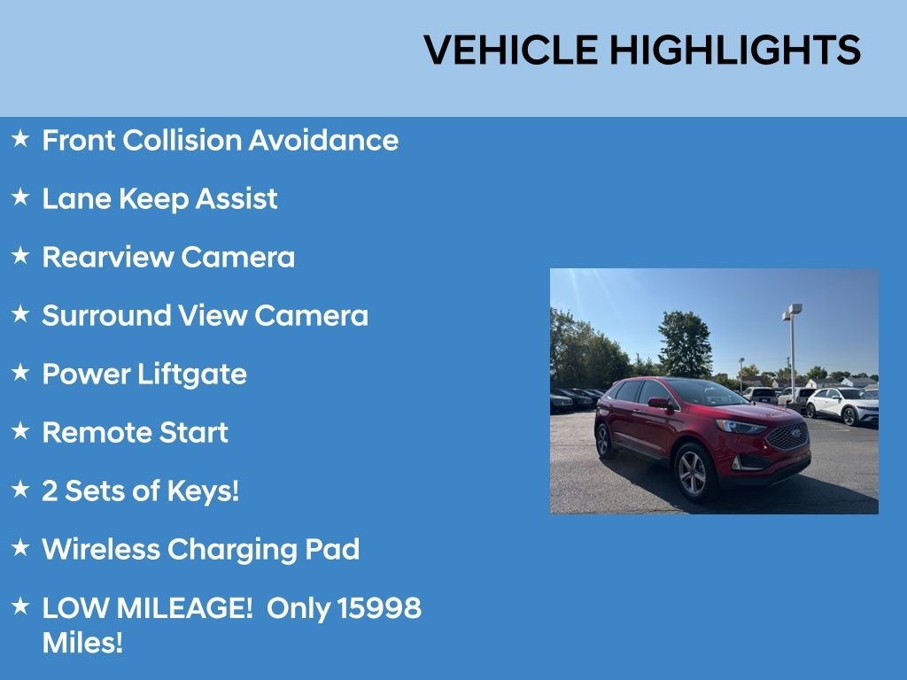 Local Trade In!, 1 Owner, Clean CARFAX, Proximity Key with PUSH BUTTON START, Apple Carplay / Android Auto, Panoramic Sunroof / Moonroof, Leather / Leatherette Seating, Heated Front Seats, Blind Spot Monitoring, Front Collision Avoidance, Lane Keep Assist, Rearview Camera, Surround View Camera, AWD, 110V/150W AC Power Outlet, 3.80 Axle Ratio, 4-Wheel Disc Brakes, 6 Speakers, ABS brakes, ActiveX Seating Material Heated Bucket Seats, Air Conditioning, Alloy wheels, AM/FM radio: SiriusXM with 360L, Auto High-beam Headlights, Auto-dimming Rear-View mirror, Automatic temperature control, Brake assist, Bumpers: body-color, Compass, Convenience Package, Delay-off headlights, Driver door bin, Driver vanity mirror, Dual front impact airbags, Dual front side impact airbags, Electronic Stability Control, Emergency communication system: SYNC 4 911 Assist, Equipment Group 201A, Fog Lamps w/Iconic Silver Bezel, FordPass Connect, Four wheel independent suspension, Front anti-roll bar, Front Bucket Seats, Front Center Armrest w/Storage, Front dual zone A/C, Front reading lights, Fully automatic headlights, Heated door mirrors, Heated front seats, Heated Steering Wheel, Illuminated entry, Knee airbag, Leather steering wheel, Leather-Wrapped Steering Wheel, Low tire pressure warning, Occupant sensing airbag, Outside temperature display, Overhead airbag, Overhead console, Panic alarm, Panoramic Vista Roof, Passenger door bin, Passenger vanity mirror, Perimeter Alarm, Power door mirrors, Power driver seat, Power Liftgate, Power passenger seat, Power steering, Power windows, Radio: AM/FM Stereo/MP3 Capable, Rear anti-roll bar, Rear Parking Sensors, Rear reading lights, Rear seat center armrest, Rear window defroster, Rear window wiper, Remote keyless entry, Remote Start System, SiriusXM w/360L, Speed control, Speed-Sensitive Wipers, Split folding rear seat, Spoiler, Steering wheel mounted audio controls, SYNC 4A w/Enhanced Voice Recognition, Tachometer, Telescoping steering wheel, Tilt steering wheel, Traction control, Trip computer, Universal Garage Door Opener (UGDO), Variably intermittent wipers, Wheels: 18" Bright-Machined Aluminum, Wheels: 18" Sparkle Silver-Painted Aluminum, Wireless Charging Pad, Power Liftgate, Remote Start, 2 Sets of Keys!, Wireless Charging Pad, LOW MILEAGE! Only 15998 Miles!, Ford Co-Pilot 360!, Homelink, AWD. Ford Edge 2023 Rapid Red Metallic Tinted Clearcoat SEL CARFAX One-Owner. Clean CARFAX. Odometer is 22322 miles below market average!