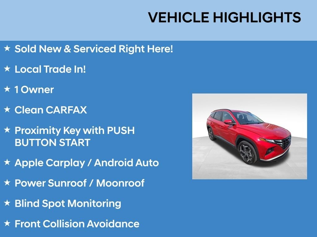 Sold New & Serviced Right Here!, Local Trade In!, 1 Owner, Clean CARFAX, Proximity Key with PUSH BUTTON START, Apple Carplay / Android Auto, Power Sunroof / Moonroof, Blind Spot Monitoring, Front Collision Avoidance, Lane Keep Assist, Rearview Camera, Power Liftgate, Smart Cruise, 2 Sets of Keys!, Wireless Charging Pad, Power Drivers Seat, AWD. Hyundai Tucson 2022 Calypso Red SEL CARFAX One-Owner. Clean CARFAX. Odometer is 4686 miles below market average!