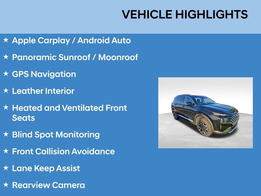 Hyundai Certified Pre-Owned Vehicle, Unbeatable 10 Year / 100k Mile Powertrain Warranty!, Sold New & Serviced Right Here!, Local Trade In!, 1 Owner, Clean CARFAX, Proximity Key with PUSH BUTTON START, Apple Carplay / Android Auto, Panoramic Sunroof / Moonroof, GPS Navigation, Leather Interior, Heated and Ventilated Front Seats, Blind Spot Monitoring, Front Collision Avoidance, Lane Keep Assist, Rearview Camera, Surround View Camera, AWD, Black w/Leather Seat Trim, 12 Speakers, 4-Wheel Disc Brakes, ABS brakes, Air Conditioning, Alloy wheels, AM/FM radio: SiriusXM, Apple CarPlay & Android Auto, Auto High-beam Headlights, Auto-dimming Rear-View mirror, Automatic temperature control, Axle Ratio: 3.316, Brake assist, Bumper Applique, Bumpers: body-color, Cargo Cover/Screen, Cargo Net, Cargo Package, Cargo Tray, Carpeted Floor Mats, Delay-off headlights, Driver door bin, Driver vanity mirror, Dual front impact airbags, Dual front side impact airbags, Electronic Stability Control, Emergency communication system, Exterior Parking Camera Rear, First Aid Kit, Four wheel independent suspension, Front anti-roll bar, Front Bucket Seats, Front Center Armrest, Front dual zone A/C, Front reading lights, Fully automatic headlights, Garage door transmitter: HomeLink, harman/kardon® Speakers, Heated & Ventilated Front Bucket Seats, Heated door mirrors, Heated front seats, Heated rear seats, Heated steering wheel, Illuminated entry, Leather Seat Trim, Leather steering wheel, Low tire pressure warning, Memory seat, Mudguards, Navigation System, Occupant sensing airbag, Option Group 01, Outside temperature display, Overhead airbag, Overhead console, Panic alarm, Passenger door bin, Passenger vanity mirror, Power door mirrors, Power driver seat, Power Liftgate, Power moonroof, Power passenger seat, Power steering, Power windows, Radio: AM/FM Harman Kardon Display Audio, Rain sensing wipers, Rear anti-roll bar, Rear seat center armrest, Rear window defroster, Rear window wiper, Remote keyless entry, Security system, Speed control, Speed-sensing steering, Split folding rear seat, Spoiler, Steering wheel mounted audio controls, Tachometer, Telescoping steering wheel, Tilt steering wheel, Traction control, Trip computer, Turn signal indicator mirrors, Variably intermittent wipers, Ventilated front seats, Wheel Locks, Wheels: 19" x 7.5J Alloy, Power Liftgate, Blue Link Ready!, 2 Sets of Keys!, Premium Harman Kardon Audio, AWD, Black w/Leather Seat Trim. Hyundai Santa Fe 2023 Twilight Black Limited CARFAX One-Owner. Clean CARFAX. Odometer is 25481 miles below market average!