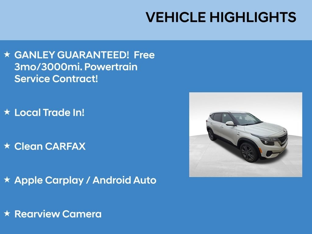 GANLEY GUARANTEED! Free 3mo/3000mi. Powertrain Service Contract!, Local Trade In!, Clean CARFAX, Apple Carplay / Android Auto, Rearview Camera, 4-Wheel Disc Brakes, 6 Speakers, 6.052 Axle Ratio, ABS brakes, Air Conditioning, Alloy wheels, AM/FM radio, Apple CarPlay & Android Auto, Brake assist, Bumpers: body-color, Carpeted Floor Mats, Cloth Seat Trim, Delay-off headlights, Driver door bin, Driver vanity mirror, Dual front impact airbags, Dual front side impact airbags, Electronic Stability Control, Exterior Parking Camera Rear, Four wheel independent suspension, Front anti-roll bar, Front Bucket Seats, Front Center Armrest, Front reading lights, Fully automatic headlights, Illuminated entry, Low tire pressure warning, Occupant sensing airbag, Outside temperature display, Overhead airbag, Overhead console, Panic alarm, Passenger door bin, Passenger vanity mirror, Power door mirrors, Power steering, Power windows, Radio: AM/FM/MP3 Display Audio, Rear window defroster, Rear window wiper, Remote keyless entry, Security system, Speed control, Speed-sensing steering, Split folding rear seat, Spoiler, Steering wheel mounted audio controls, Tachometer, Telescoping steering wheel, Tilt steering wheel, Traction control, Trip computer, Variably intermittent wipers, Wheels: 17" Alloy w/Dark Gray Finish. Kia Seltos 2021 Snow White Pearl LX Clean CARFAX.