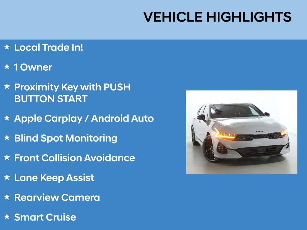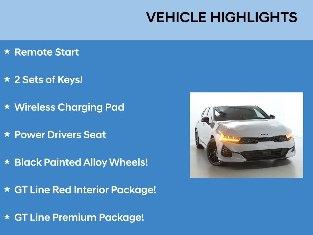 Local Trade In!, 1 Owner, Proximity Key with PUSH BUTTON START, Apple Carplay / Android Auto, Blind Spot Monitoring, Front Collision Avoidance, Lane Keep Assist, Rearview Camera, 4-Wheel Disc Brakes, 6 Speakers, ABS brakes, Air Conditioning, Alloy wheels, AM/FM radio: SiriusXM, Apple CarPlay & Android Auto, Auto High-beam Headlights, Automatic temperature control, Brake assist, Bumpers: body-color, Carpeted Floor Mats, Cloth/SynTex Seat Trim, Delay-off headlights, Driver door bin, Driver vanity mirror, Dual front impact airbags, Dual front side impact airbags, Electronic Stability Control, Forward Collision Avoidance-Assist, Four wheel independent suspension, Front anti-roll bar, Front Bucket Seats, Front Center Armrest, Front dual zone A/C, Front fog lights, Front reading lights, Fully automatic headlights, GT-Line Premium Package, GT-Line Red Interior Package, Heated door mirrors, Heated Front Bucket Seats, Heated front seats, Heated steering wheel, Highway Driving Assist, Illuminated entry, Knee airbag, LED Projection Headlamps, Low tire pressure warning, Navigation System, Occupant sensing airbag, Outside temperature display, Overhead airbag, Overhead console, Panic alarm, Passenger door bin, Passenger vanity mirror, Power door mirrors, Power driver seat, Power steering, Power windows, Radio data system, Radio: AM/FM/MP3 Audio System, Rear anti-roll bar, Rear seat center armrest, Rear side impact airbag, Rear window defroster, Remote keyless entry, Security system, Smart Cruise Control w/Stop & Go, Speed control, Speed-sensing steering, Split folding rear seat, Spoiler, Sport steering wheel, Steering wheel mounted audio controls, Tachometer, Telescoping steering wheel, Tilt steering wheel, Traction control, Trip computer, Turn signal indicator mirrors, Variably intermittent wipers, Wheels: 18" Gloss Black Machined Finish Alloy, Smart Cruise, Remote Start, 2 Sets of Keys!, Wireless Charging Pad, Power Drivers Seat, Black Painted Alloy Wheels!, GT Line Red Interior Package!, GT Line Premium Package!. Kia K5 2023 Wolf Gray GT-Line
