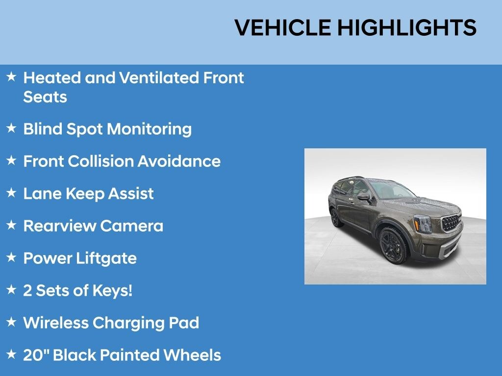 Local Trade In!, 1 Owner, Clean CARFAX, Proximity Key with PUSH BUTTON START, Apple Carplay / Android Auto, Power Sunroof / Moonroof, GPS Navigation, Leather Interior, Heated and Ventilated Front Seats, Blind Spot Monitoring, Front Collision Avoidance, Lane Keep Assist, Rearview Camera, Power Liftgate, 2 Sets of Keys!, Wireless Charging Pad, 20" Black Painted Wheels. Kia Telluride 2023 Dark Moss EX X-Line CARFAX One-Owner.