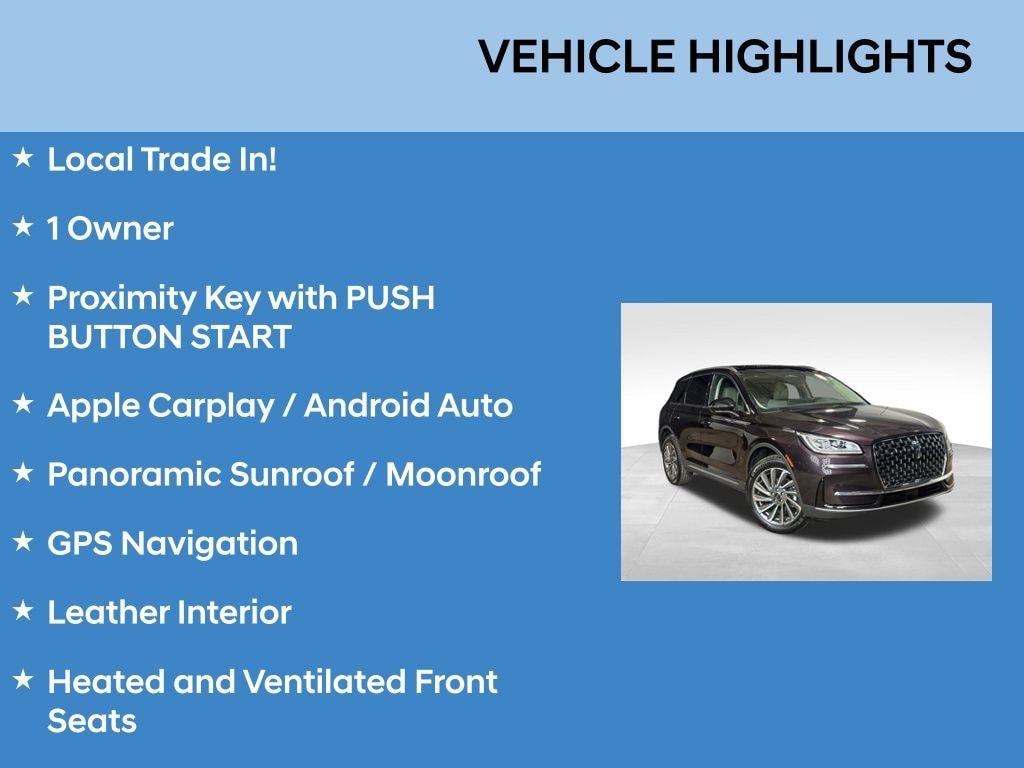 Local Trade In!, 1 Owner, Proximity Key with PUSH BUTTON START, Apple Carplay / Android Auto, Panoramic Sunroof / Moonroof, GPS Navigation, Leather Interior, Heated and Ventilated Front Seats, Blind Spot Monitoring, Front Collision Avoidance, Lane Keep Assist, Rearview Camera, Surround View Camera, Power Liftgate, 2 Sets of Keys!, Wireless Charging Pad. Lincoln Corsair 2023 Crystal Red Metallic Premium Clearcoat Reserve CARFAX One-Owner.