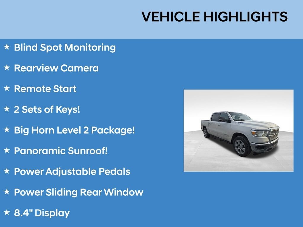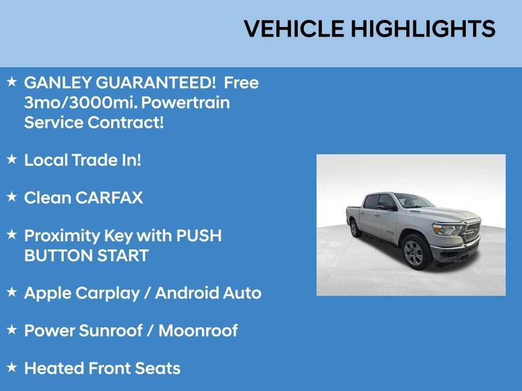GANLEY GUARANTEED! Free 3mo/3000mi. Powertrain Service Contract!, Local Trade In!, Clean CARFAX, Proximity Key with PUSH BUTTON START, Apple Carplay / Android Auto, Power Sunroof / Moonroof, Heated Front Seats, Blind Spot Monitoring, Rearview Camera, Remote Start, 2 Sets of Keys!, Big Horn Level 2 Package!, Panoramic Sunroof!, Power Adjustable Pedals, Power Sliding Rear Window, 8.4" Display. Ram 1500 2020 Bright White Clearcoat Big Horn/Lone Star Clean CARFAX. Odometer is 4398 miles below market average!