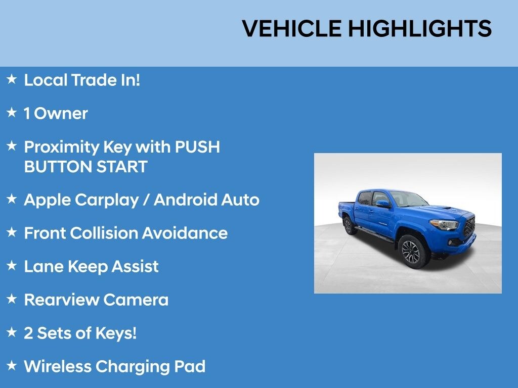 Local Trade In!, 1 Owner, Proximity Key with PUSH BUTTON START, Apple Carplay / Android Auto, Front Collision Avoidance, Lane Keep Assist, Rearview Camera, 2 Sets of Keys!, Wireless Charging Pad, Power Drivers Seat, Power Sliding Rear Windows, 4WD. Toyota Tacoma 2021 Voodoo Blue CARFAX One-Owner.